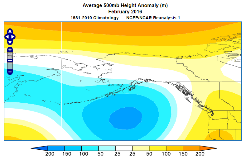 The persistence of abnormal warmth in Alaska in the past few months has been nothing short of amazing. A strongly positive PDO phase and strong (though now decaying) El Niño conditions have maintained a remarkably steady circulation pattern over the northeastern Pacific sector, leading to a seemingly never-ending flow of warm air into Alaska. The maps below show the remarkable month-to-month similarity of the 500mb height anomalies so far this year: